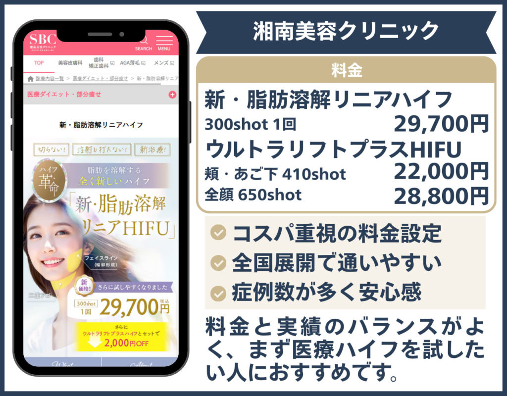 湘南美容クリニックは、とにかくコスパ良く医療ハイフを受けたい人にまずチェックしてほしい大手クリニックです。