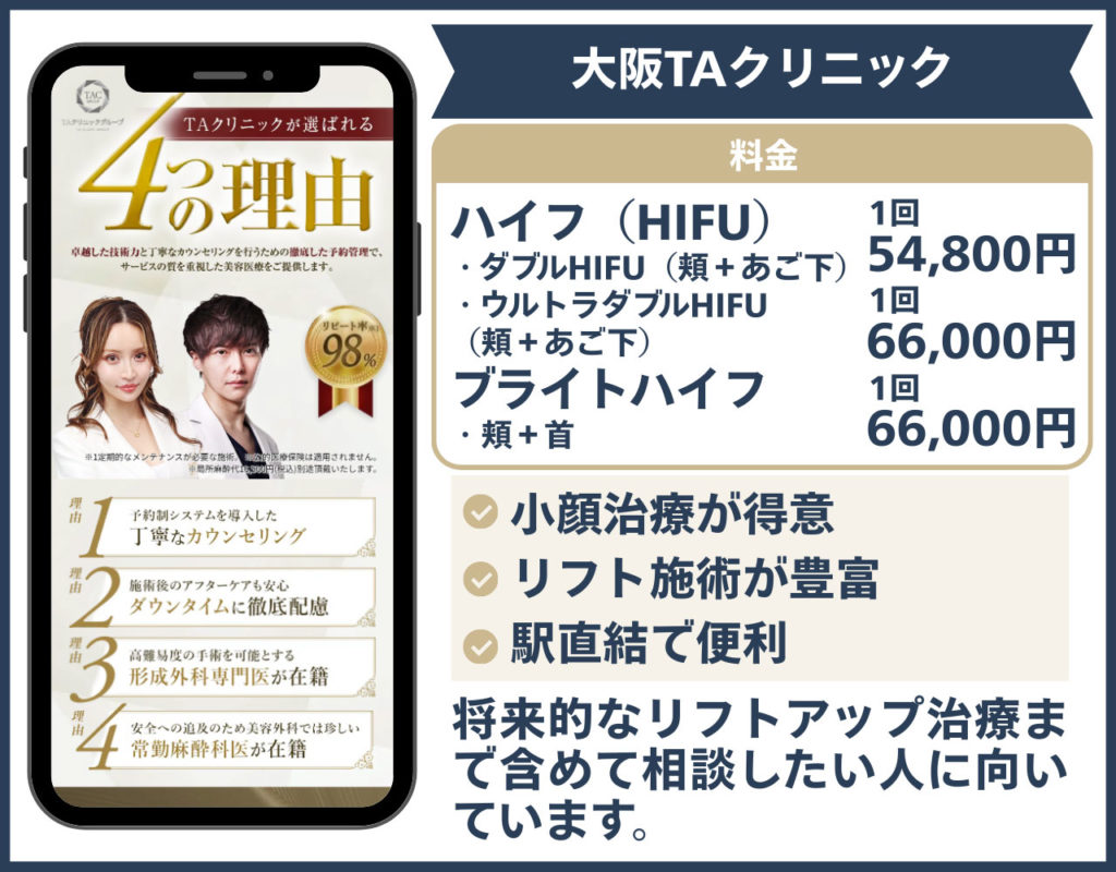 TAクリニックは、小顔治療全般に強く、「ハイフを入り口に将来的なステップアップも考えたい」人に向いているクリニックです。