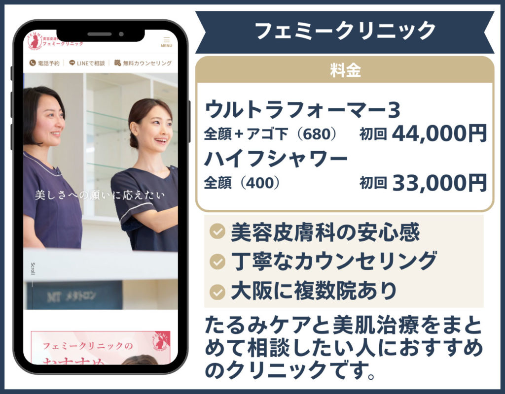 フェミークリニックは、「たるみ治療をしっかり行いたい」層に向けておすすめしたい美容皮膚科寄りのクリニックです。