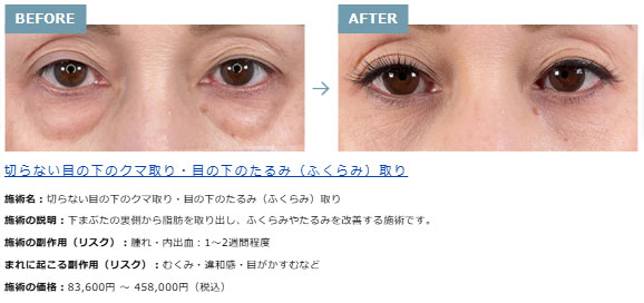 | 切らない目の下のクマ取り ・目の下のたるみ(ふくらみ)取り | スタンダード | 83,600円 |